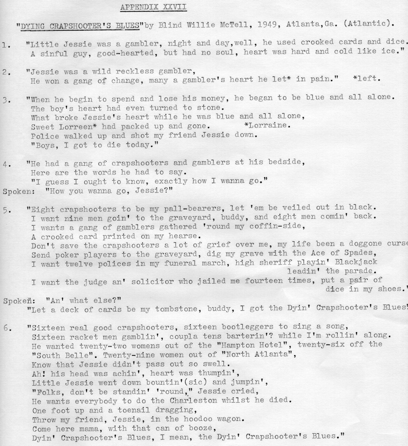 "Dying Crapshooter's Blues" by Blind Willie McTell, 1949, Atlanta, Ga. (Atlantic).